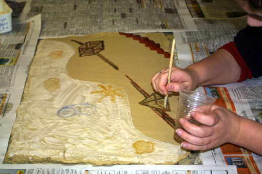 | Unsere Arbeitstische haben wir zu großen Flächen zusammengeschoben. Plastikfolie und alte Zeitungen dienen als Arbeitsunterlage. | Der Mörtel kommt mitten auf den Tisch und wird zu dem gewünschten Bildformat zu einer 1-cm-Schicht auseinander gestrichen. | Nun kommt die Bewehrung hinein. Das flachgebogene Darhtgitter wird aufgelegt. Eine weitere Mörtelschicht kommt darauf, so dass das Gitter mittendrin steckt. | Mit der Kelle wird die Platte glatt gestrichen. Jetzt geht es an die künstlerische Arbeit. Wir müssen uns in der Gruppe auf ein Motiv einigen! |